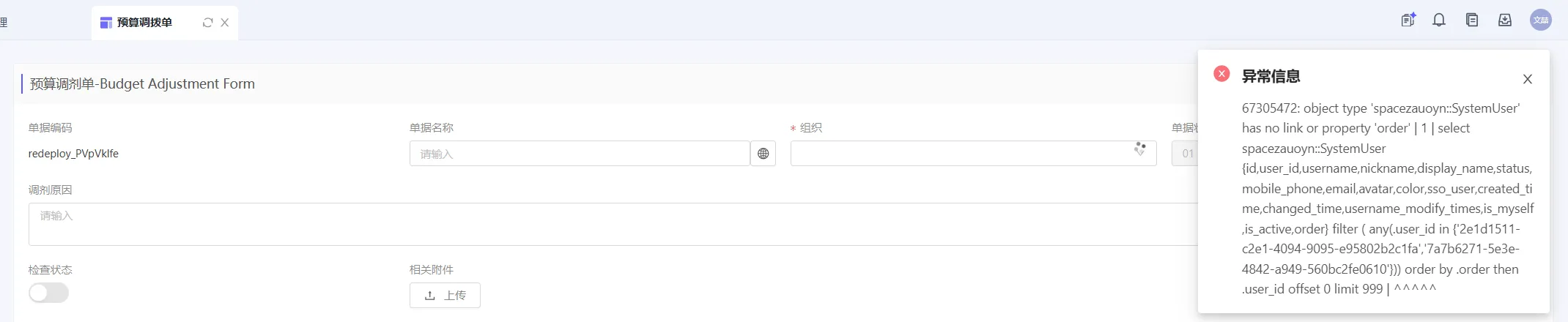 问题:打开UX或DeepModel控制台->SystemUser数据管理,显示异常信息:object type ‘spacexxx:SystemUser’ has no link or property ‘order’ | 1 | select spacexxx::SystemUser {…}(存量SystemUser可能有该问题)