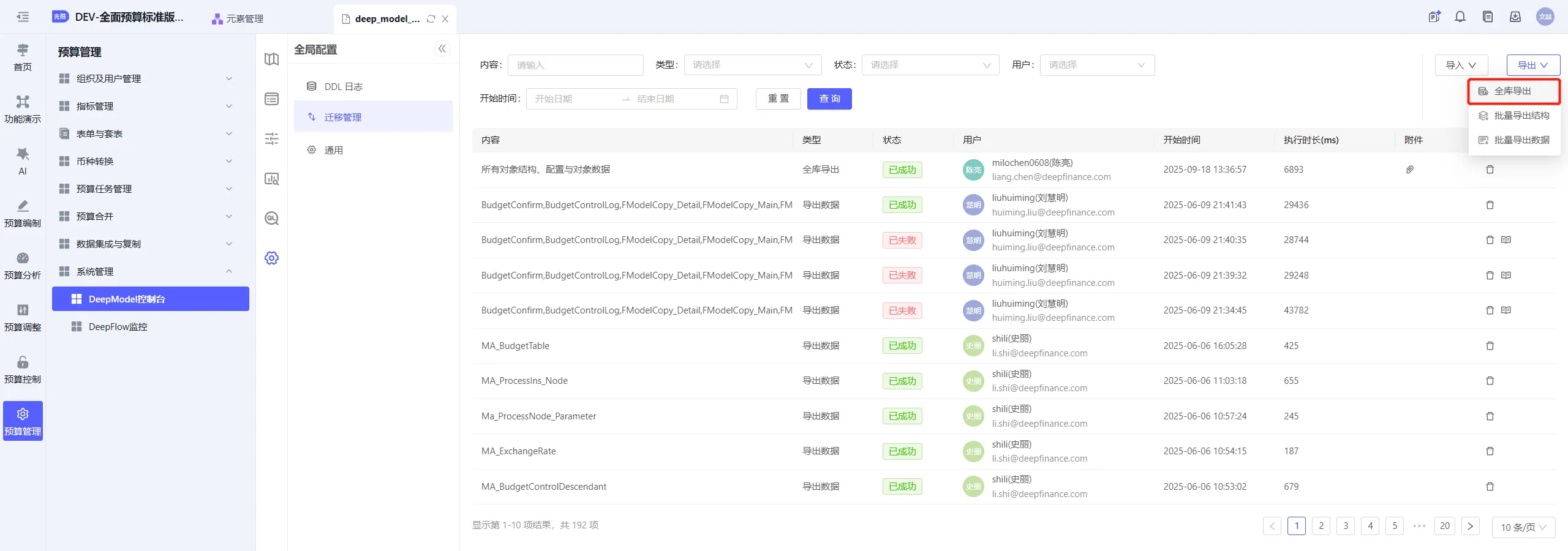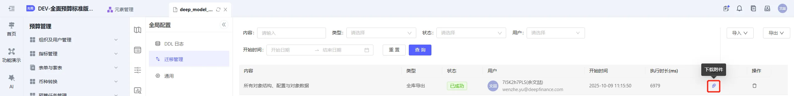 源应用进入DeepModel控制台->全局配置->迁移管理,全库导出对象结构、配置与对象数据