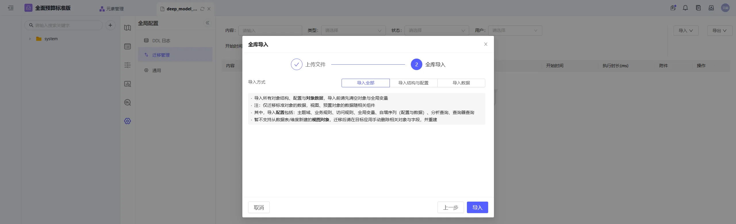 目标应用进入DeepModel控制台->全局配置->迁移管理,上传导出文件,全库导入对象结构、配置与对象数据