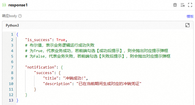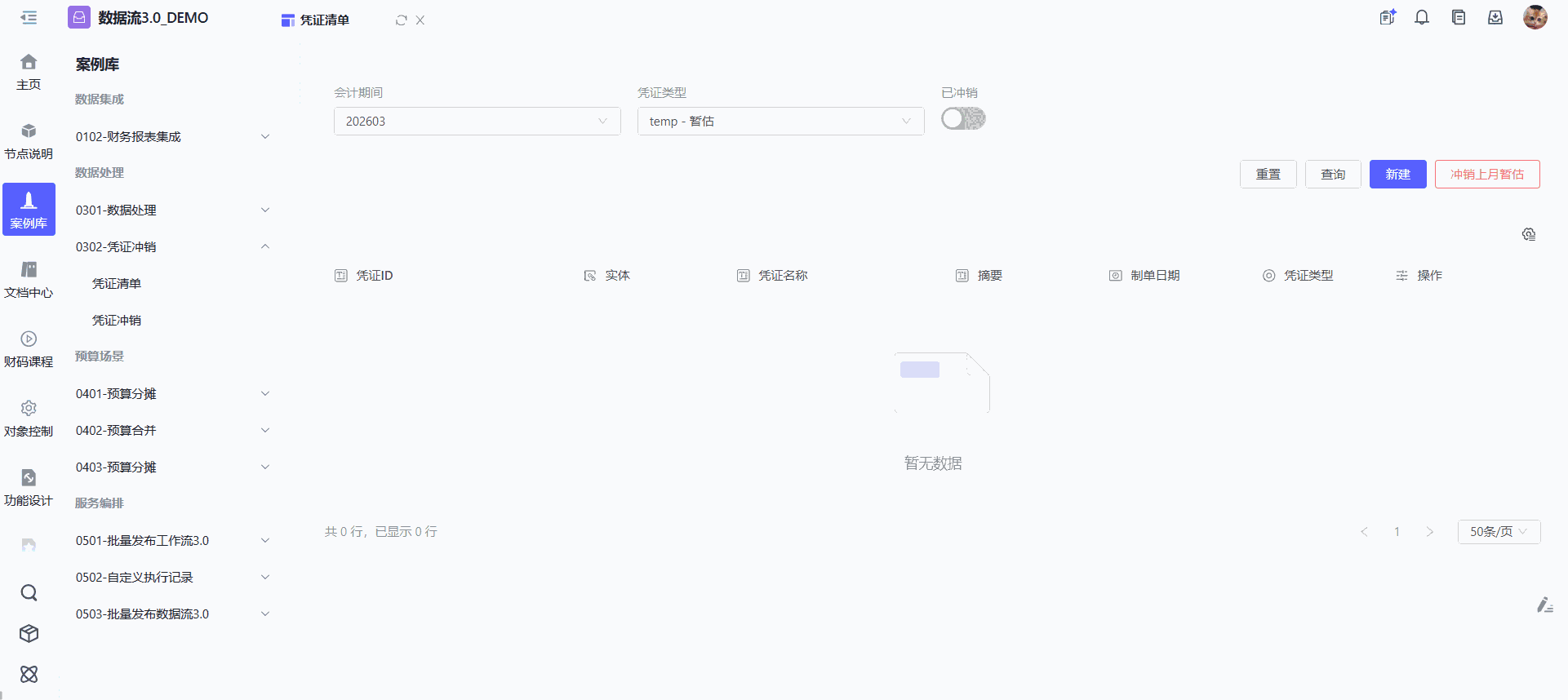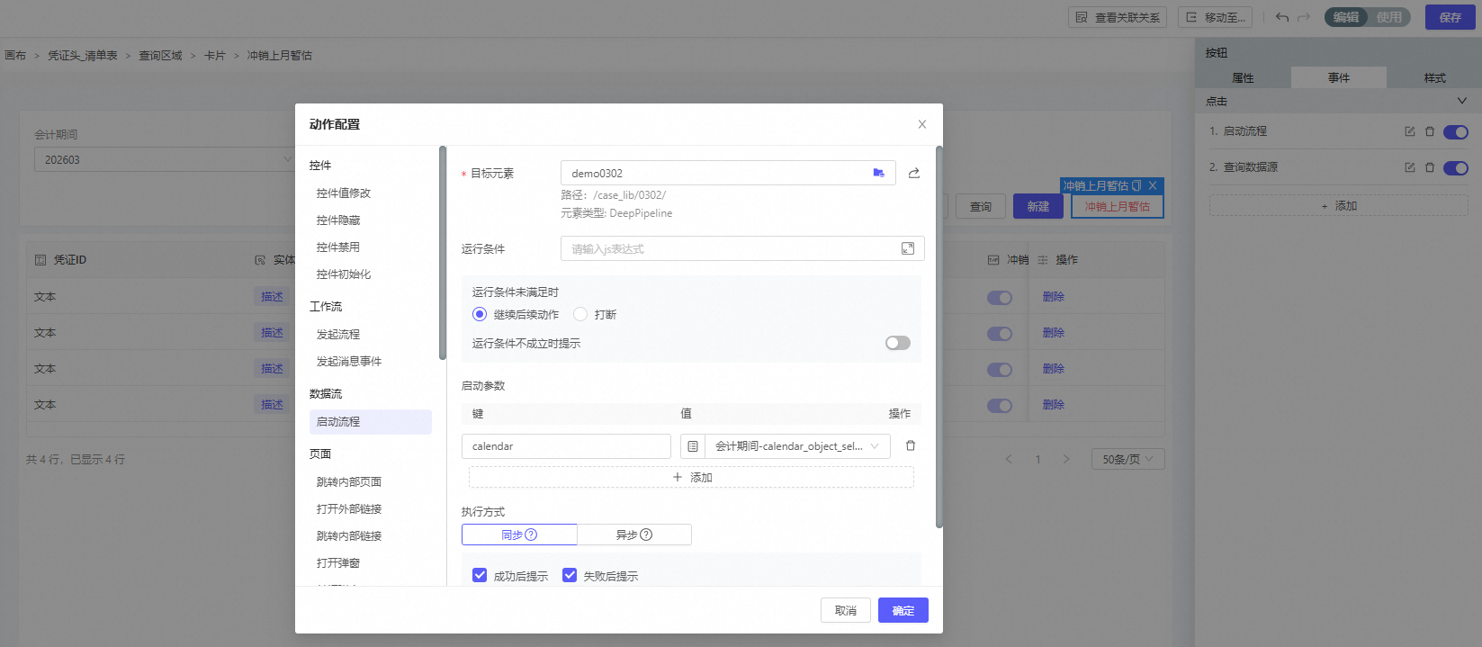 用于发起前序配置的数据流,同步执行后返回响应,再查询数据源以查看新生成的冲销凭证。