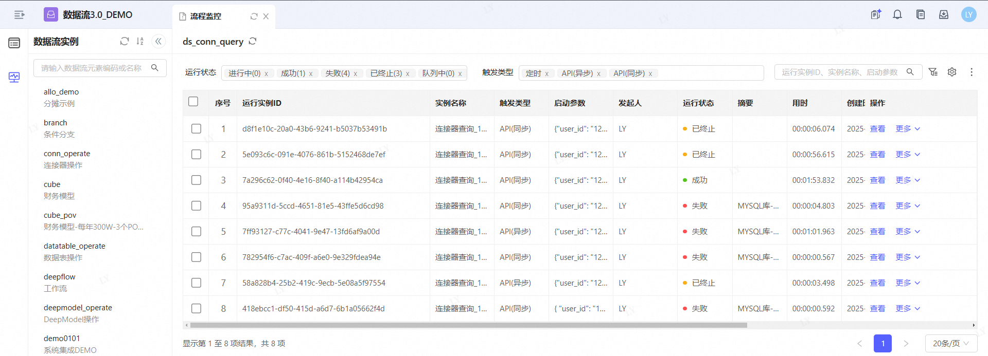上次运行时间,点击更多,可以跳转到历史的数据流实例页面