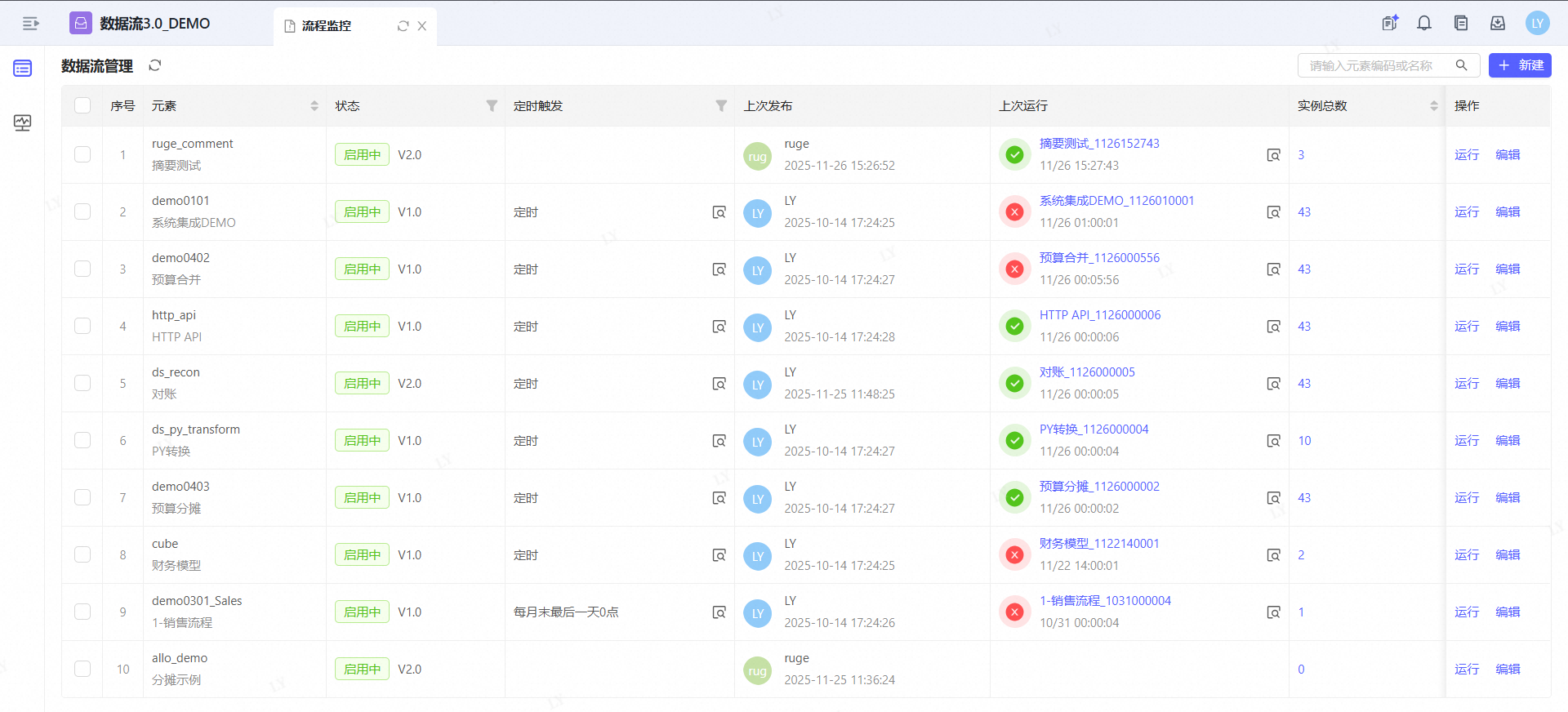 流程概览:以表头样式展示数据流实例的相关信息,右侧提供按钮