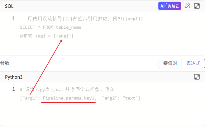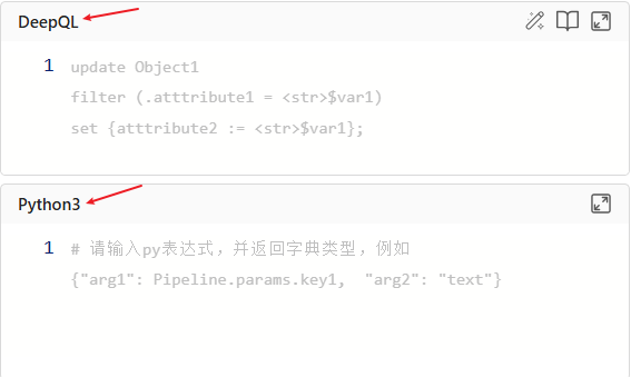除代码框外,也有输入表达式的配置项,会在占位提示该表达式的语言,以Python为例: