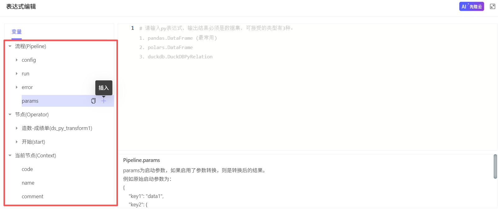 输入PY表达式时,进入代码框全屏状态,会在左侧展示可引用的预置变量。