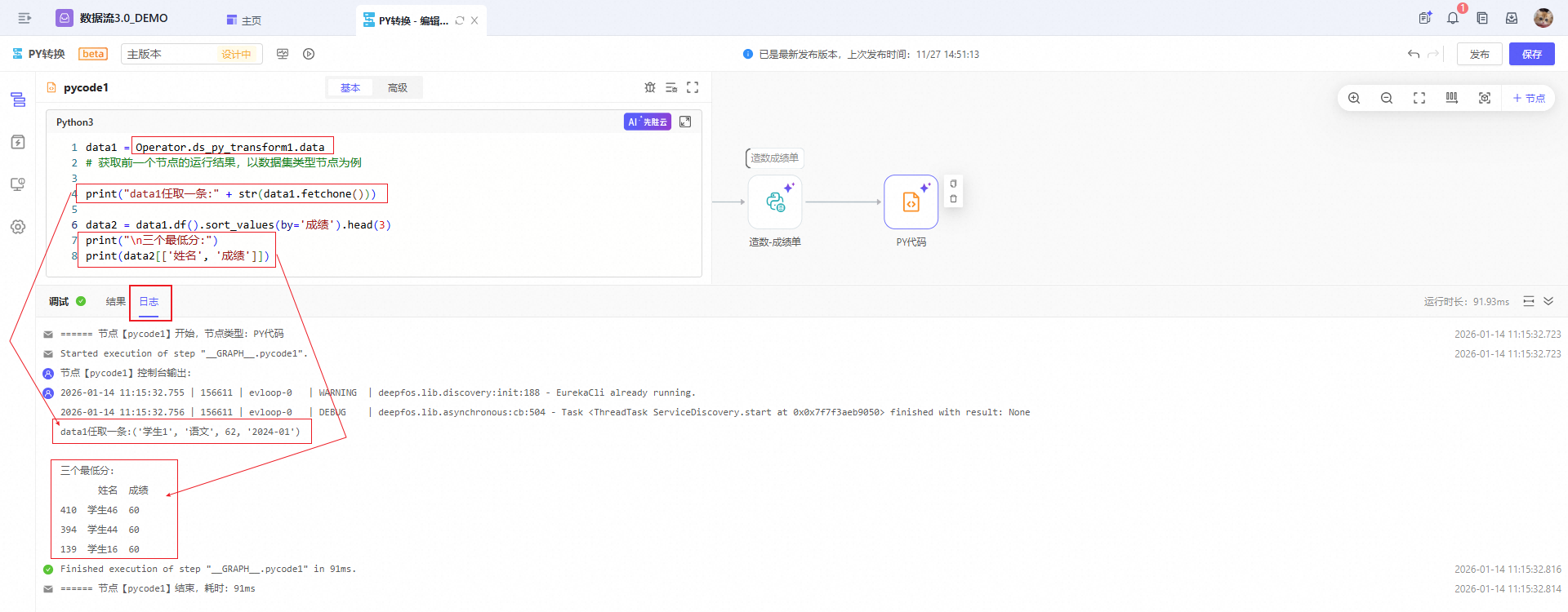 在Python代码框中,可以将需要评估的表达式用print打印到日志中查看,例如: