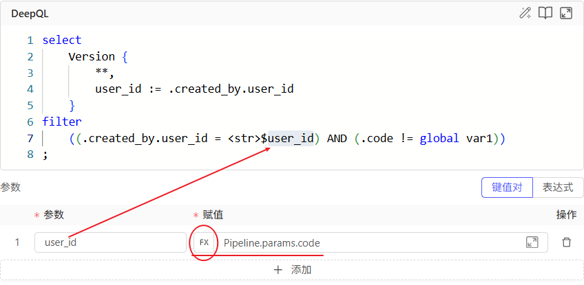 与SQL同理,DeepQL中也无法直接输入变量名来引用,需要: