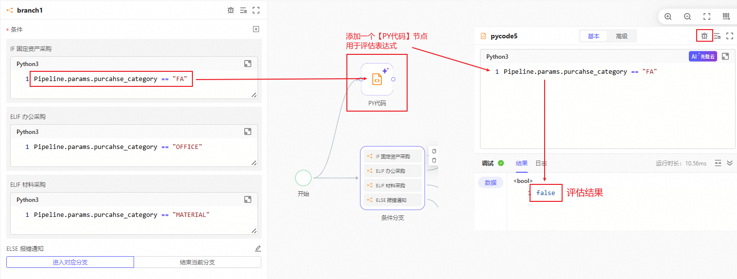 当然,也可以直接用【PY代码】节点调试来输出结果。以【条件分支】节点为例,需要在每个条件块中输入python代码,档代码较复杂时,则可以添加一个【PY代码】节点来辅助判断代码的正确性。
