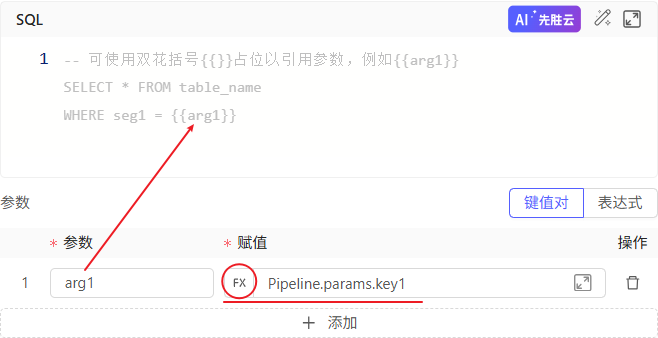 1、在SQL中先用双花括号占位,在占位中定义参数,若同一个SQL框中需要定义多个参数,命名时不要重复;