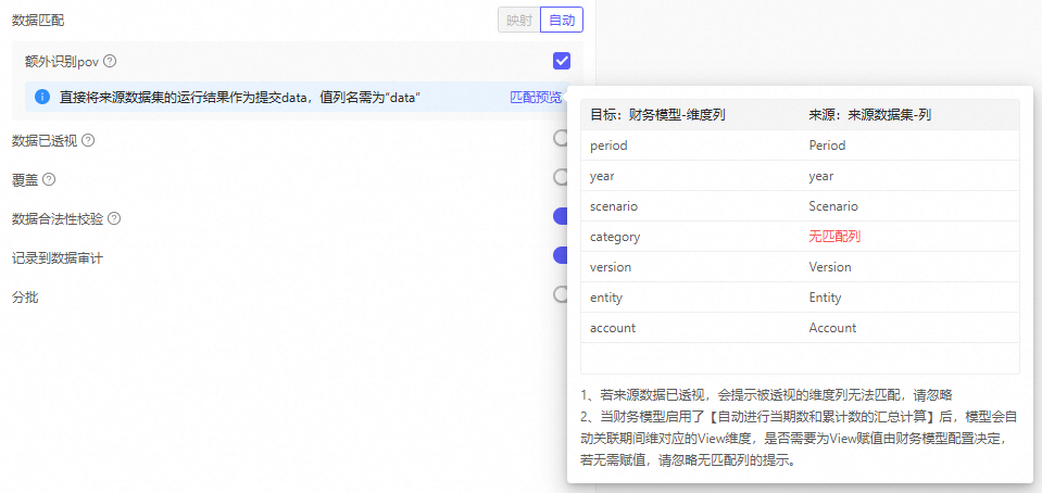 额外识别pov:提交给财务模型的数据分为两部分,pov和data,pov必须是单值,data可以是多值。启用此选项,则会先识别来源数据集的运行结果,如果有列的数据去重后唯一,则可以作为pov提交,不唯一则作为data提交,指定明确的pov可以提升财务模型保存数据的性能,但是解析来源数据集的数据也需要额外花费解析的时间,请根据实际情况选择是否需要启用此功能!