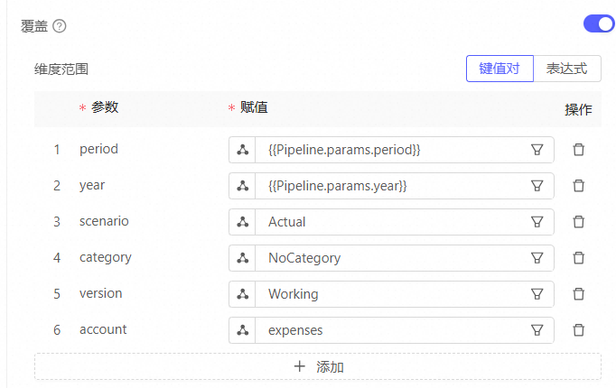 维度:维度成员选择器,回显至文本框后,可以手动修改表达式,支持用双花括号**{{}}**占位来引用预置变量。例如通过维度成员选择器选择了Base(2020,0),可以手动修改为Base({{Pipeline.Params.Year}},0),当启动参数的Year值为2020时,可得到维度表达式Base(2020,0)