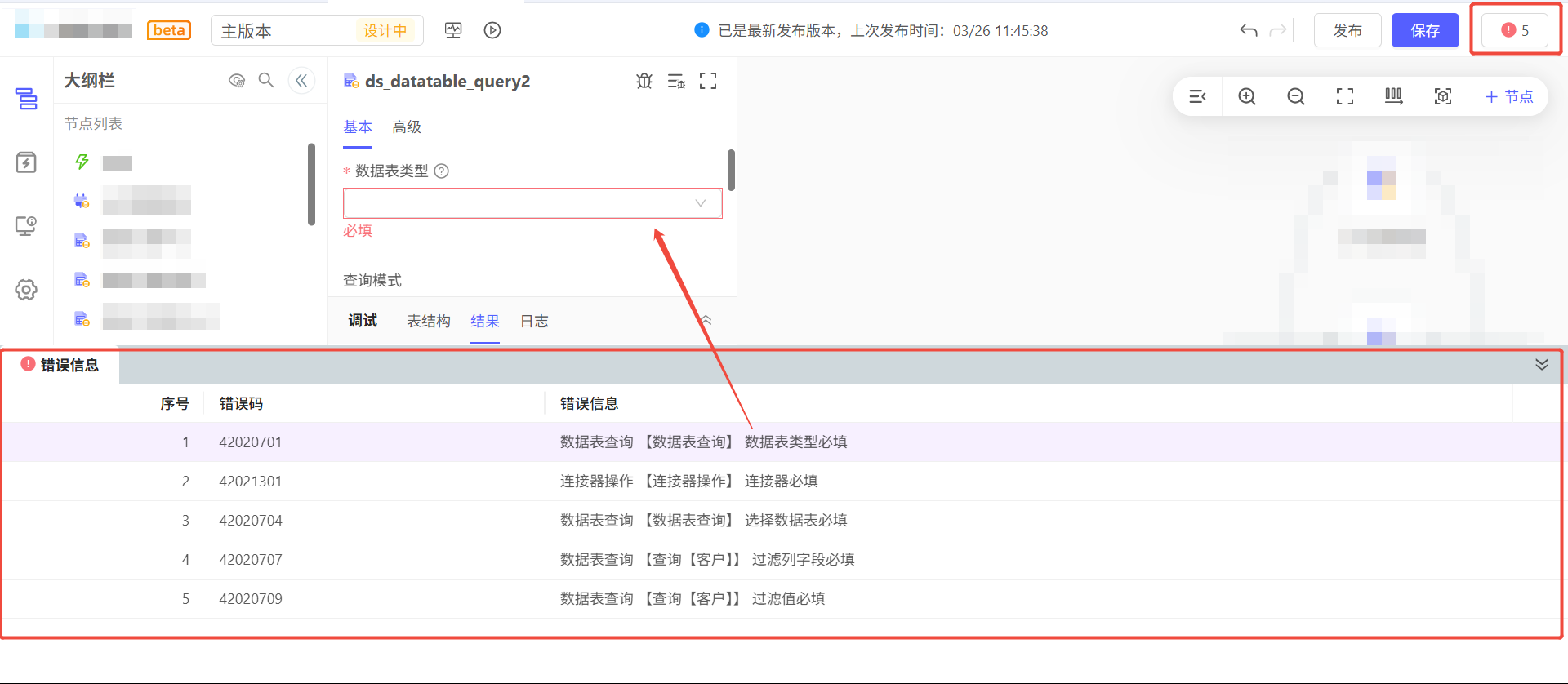 元素保存或者发布时,会进行校验,校验不通过的内容会以表格样式展示在底部,点击每一行可以定位至具体配置处。