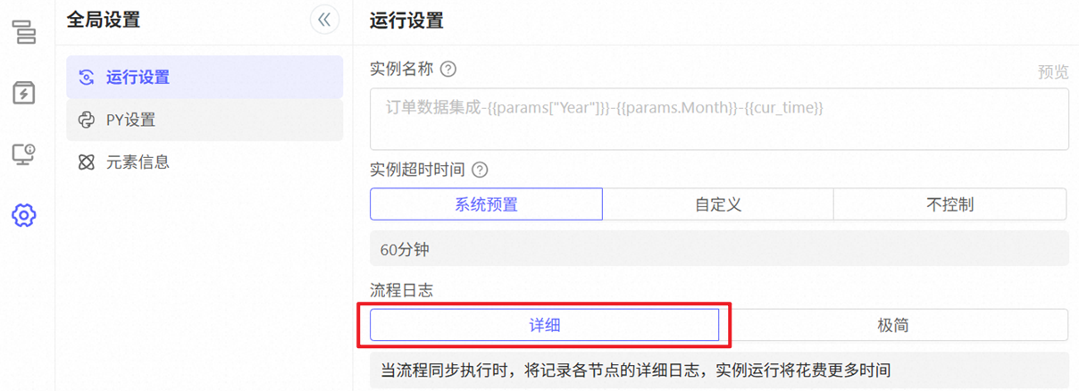 1、对于使用率高,且不关注日志的流程,流程日志级别改为【极简】(例如只进行数据处理的流程,可以只关注数据结果,无需日志);